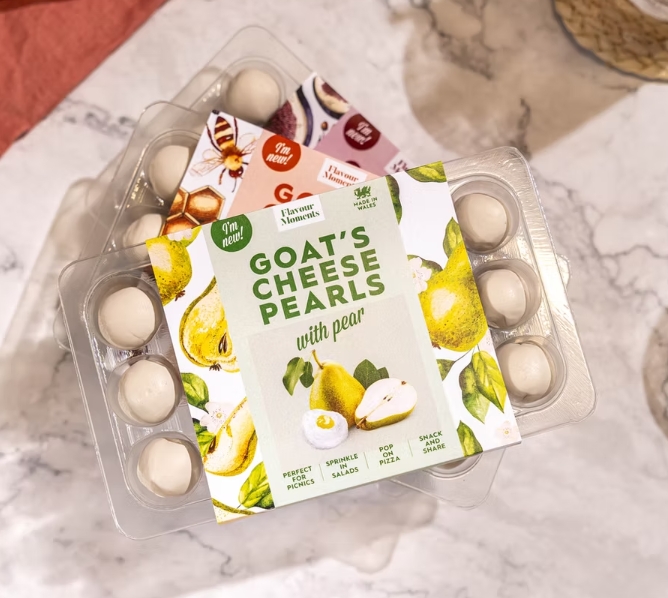 Flavour Moments are formed of Wiltshire-made goats’ cheese, moulded into ‘pearls’, with different jam-like fillings – currently Fig, Honey or Pear, but with the Christmas special of Truffle Honey soon to be part of the core range too.